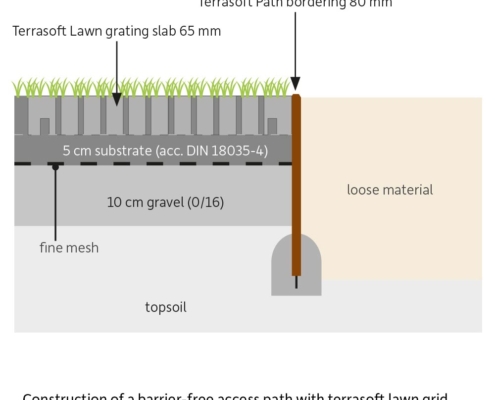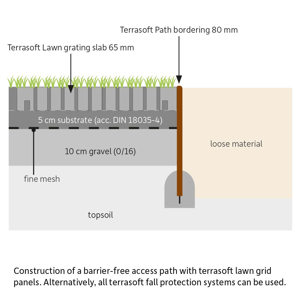 The Terrasoft path edging with EPDM cover is a durable and visually distinctive lateral boundary for fall protection slabs. It ensures safe installation and prevents shifting. Ideal for retrofitting play areas without major reconstruction. The colored edge improves orientation, particularly for individuals with visual or cognitive impairments.